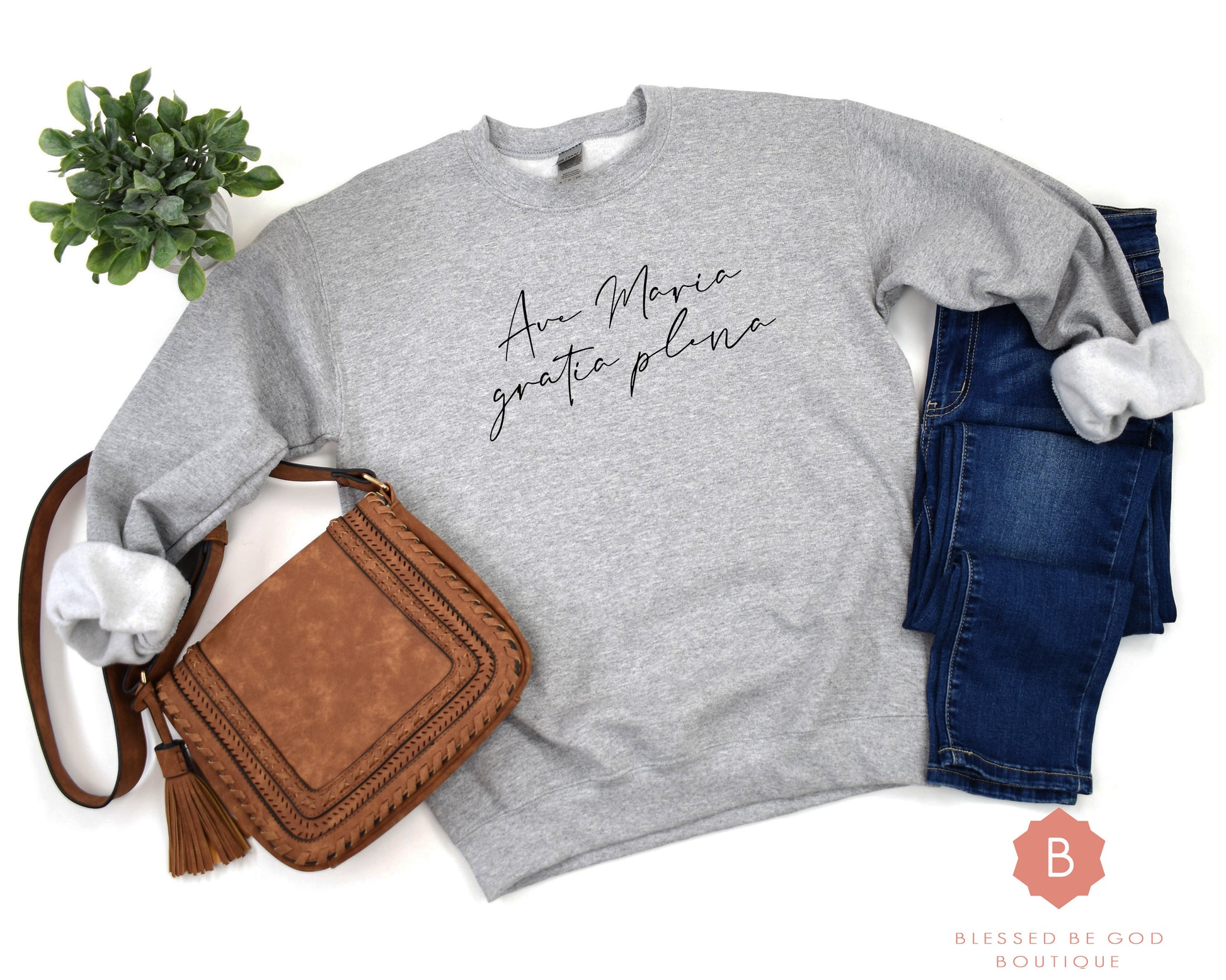 Ave Maria Catholic Sweatshirt, Grey, White, Pink