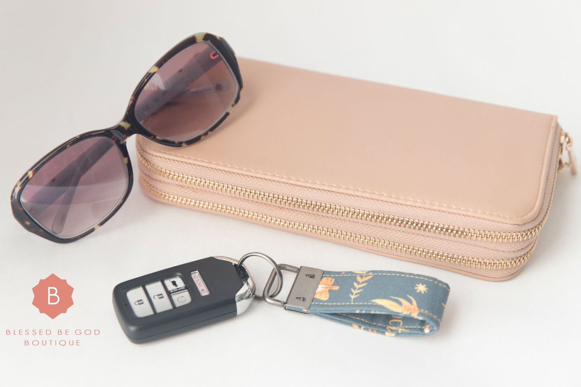 Metal hardware allows you to attach your keys. You can also attach the keyring to your purse, and diaper bag and add charms and tassels for decor.